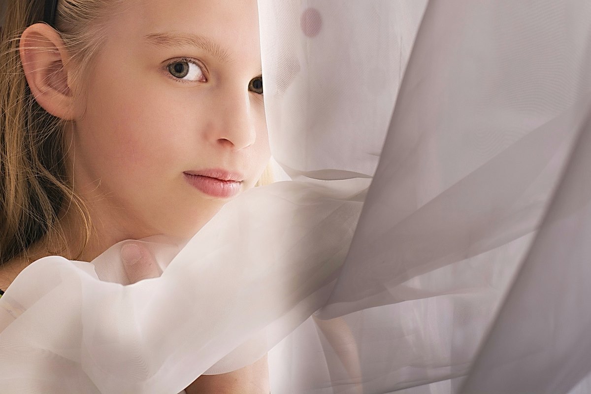 Krásny výraz a celkový pocit z tohoto záberu, pretože ona má taký úžasný pohľad... vťahuje do záberu, o to viac, že je napoly schovaná za látkou. Znova... dokonalý výraz... a žiadne úsmevy... iba úžasná tvár uprene hľadiaca priamo do objektívu... a to nás núti zastaviť sa. Svetlo je jemné, ale aj tak tu vytvára silný dojem... ale je to najmä tá póza a látka, čo poslalo tento záber medzi víťazov! Výborná práca!