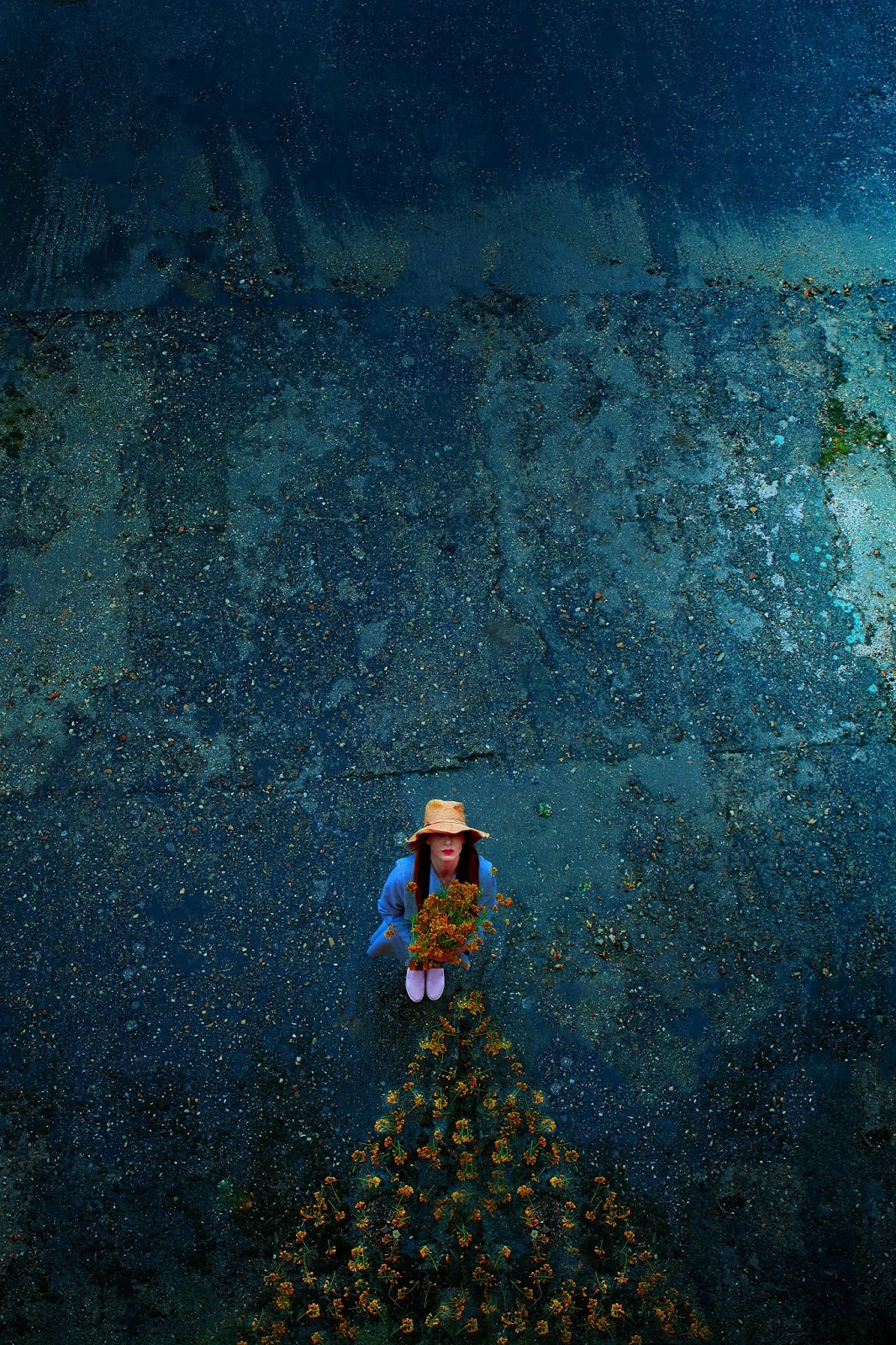 Minimalistický, ale graficky silný záběr, který ve svůj prospěch využívá barvy, dodání lidského prvku a tvar šipky, směřující přímo k objektu. Dojem znásobuje i úhel - pohled shora dolů. Kreativní kompozice!
